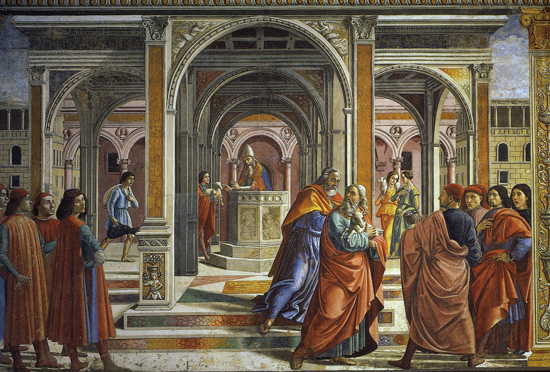 Ghirlandaio, at the end of the quattrocento, has retained Giotto’s definitive organisation of the episode, down to the slightly pained expression on Joachim’s face. The architectural and spatial system, however, is now an adequate counterbalance to the figural groupings. The handling of rational space has, for a while, overmastered the challenge of bodies.