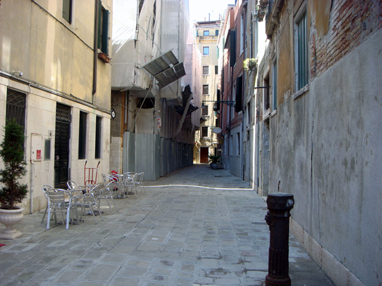 Venice is all backstreets. More precisely, named paths. Calle, salizzada, ruga, rio, ramo. Or quays. Fondamenta. Paths duck under buildings (sottoportego) cross tiny bridges, skirt palazzi. It is impossible to keep any sort of classical, linear, cartographical, geopositioning in mind. Buildings are numbered in the thousand, by sestiere, not by street. Where do you stand in relation to the Grand Canal (itself twisting through space), the Guidecca, the Redentore, St. Mark's? Or for that matter in relation to the coast, the sun, the great curve of the sky?